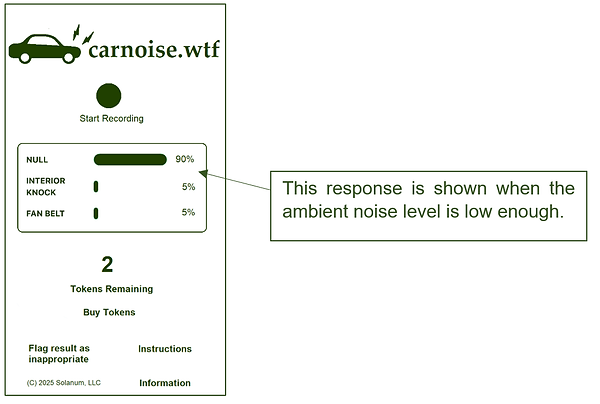 The site is not a “direct” diagnostic tool like a code reader or a compression tester, it cannot be used to prove the existence or non-existence of any vehicle malfunction. It simply suggests a place to start looking. Furthermore, it does not recognize all malfunction sounds, but rather the majority of common ones. Currently, the model is trained to distinguish the sounds of no problem (“NULL”), brake grinding, loose suspension and brake components, bound steering and suspension, knocks from the interior, fan belt slippage, wheel bearing wear, and mechanical engine malfunctions.